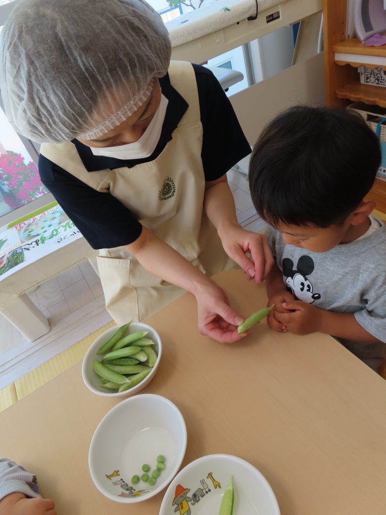 様々な食品の特徴や栄養などについて、栄養士から話を聞いたり、食材に触れたりし、身近な食材を使って食べることの楽しさを感じながら食への興味を育てていきます。
